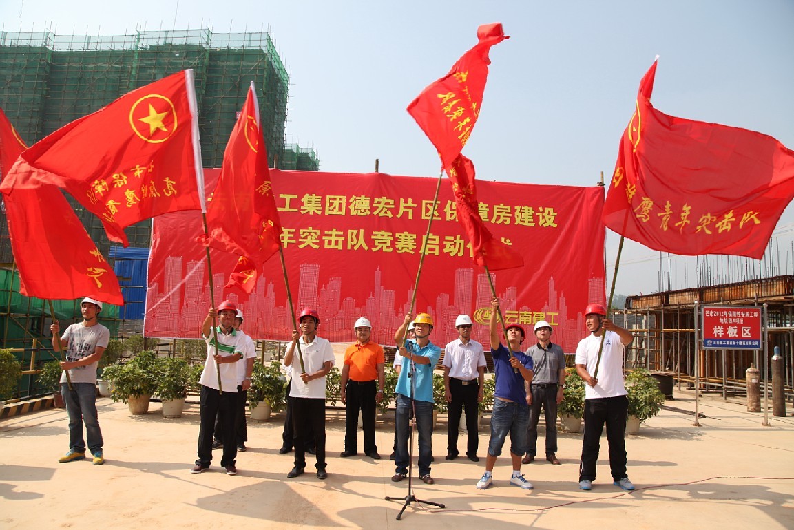 為確保“兩個轉移”落地生根,全面完成好2013年保障性住房建設,公司作為保障房德宏片區青年突擊隊建功競賽活動的責任單位,在該片區各項目點成立青年突擊隊,開展以比安全、比質量、比進度、比形象為主要內容的競賽活動。5月23日,公司團委在德宏保障性住房四A地塊舉行德宏片區保障房青年突擊隊競賽啟動儀式,共青團德宏州州委副書記李二喊過,集團團委副書記雷棲,集團指揮部副指揮長董義國,鄉投公司德宏分公司經理楊照,鄉投公司德宏分公司書記、副經理朱紅喜,鄉投公司德宏分公司總工程師王長錄等出席儀式,儀式由公司團委書記丁溪主持,九家施工單位12支青年突擊隊150余人參加啟動儀式。