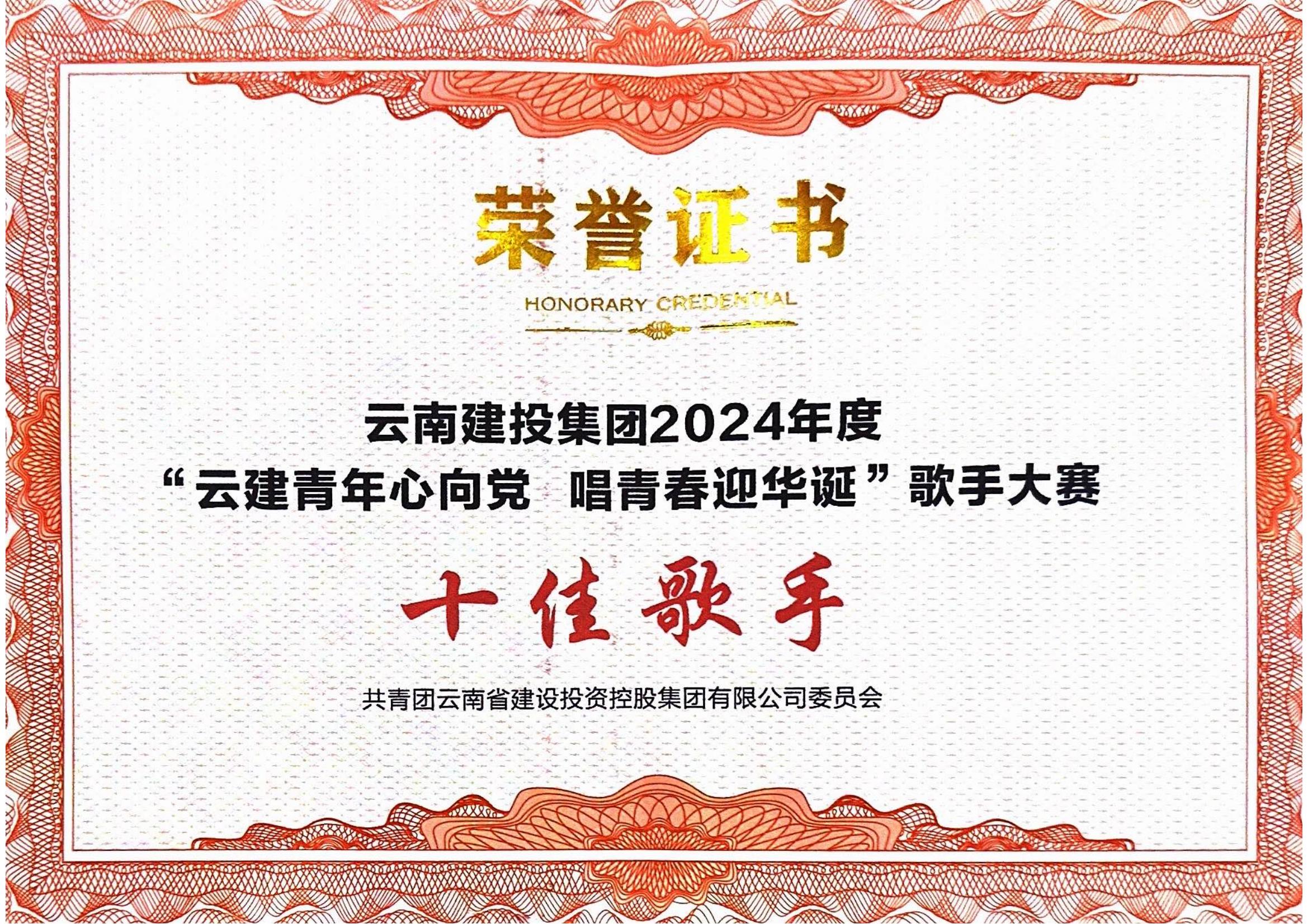 9月29日,公司參賽選手唐鵬杰在集團(tuán)“云建青年心向黨 唱響青春迎華誕”歌手大賽中榮獲第二名,獲“十佳歌手”稱號(hào)。